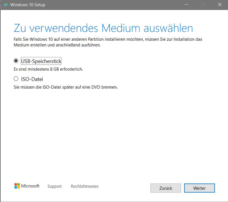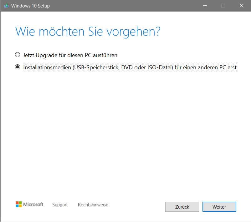 Als Startmedium wird ein Windows-Installationsmedium benötigt, mit dem man auch eine Neuinstallation des Systems vornehmen könnte. Das Installationsmedium erstellt man mit dem Media Creation Tool, das man sich aus dem Internet herunterladen kann.