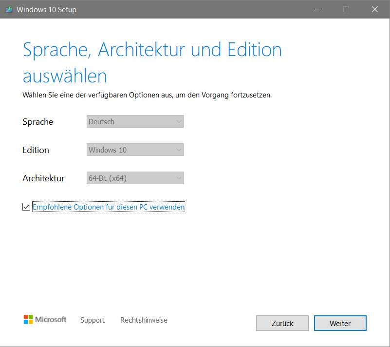 Wahrscheinlich soll das Installationsmedium für genau diesen Computer sein. Dann lässt man den Haken bei Empfohlene Optionen für diesen PC verwenden und klickt auf weiter. Wenn das Medium für einen anderen Computer sein soll, entfernt man den Haken und muss dann im oberen Teil das Zielsystem aussuchen.