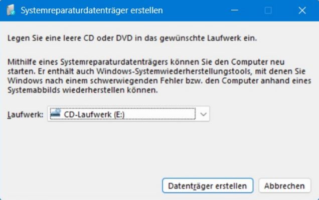 Für den Reparaturdatenträger ruft man die Systemsteuerung auf. Anschließend klickt man auf den Punkt Sichern und Wiederherstellen bzw. Sicherung des Computers erstellen. Anschließend klickt man links auf Systemreparaturdatenträger erstellen. Es erscheint das folgende Bild.