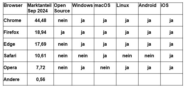 Zusätzlich ist vermerkt, für welche Betriebssysteme es den betreffenden Browser gibt.