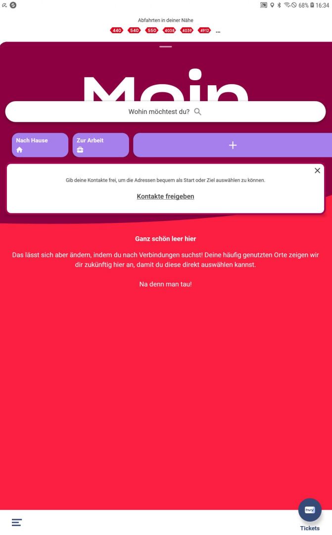Nun ist  man im „Grundbild“ der App gelandet. Um Fahrkarten kaufen zu können, muss man aber noch einige Einstellungen machen.