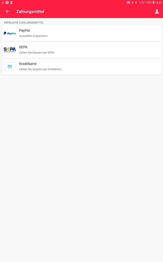 Hier hat man hat dann die Auswahl zwischen Zahlung per PayPal, SEPA-Bankeinzug, und Kreditkarte. Wenn man PayPal wählt, muss man sich anschließend einmal mit seiner PayPal-Kennung und Passwort  bei PayPal anmelden. In den beiden anderen Fällen muss man die entsprechenden Daten wie Kreditkartennummer oder IBAN eingeben.