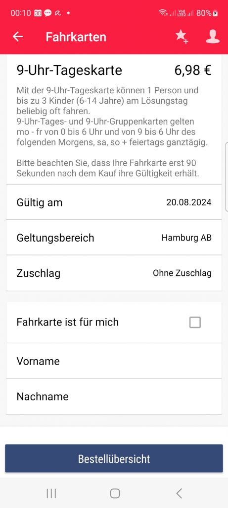 Falls die Fahrkarte für eine andere Person sein soll, muss man die Checkbox bei Fahrkarte ist für mich abwählen. Dann erscheinen darunter zwei Felder, in die man den Namen der Person einträgt.  Am Ende klickt man auf Bestellübersicht.