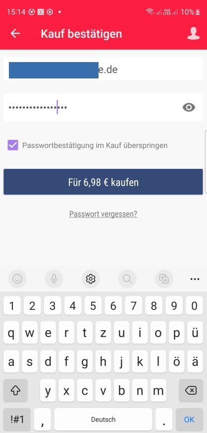 Hier gibt man das zu dem Konto gehörende Passwort ein. Wenn man der einzige Nutzer des Smartphones ist, kann man darunter neben Passwortbestätigung im Kauf überspringen die Checkbox wählen. Dann muss man in Zukunft das Passwort nicht mehr eingeben. Anschließend tippt man auf Für xxxx kaufen.