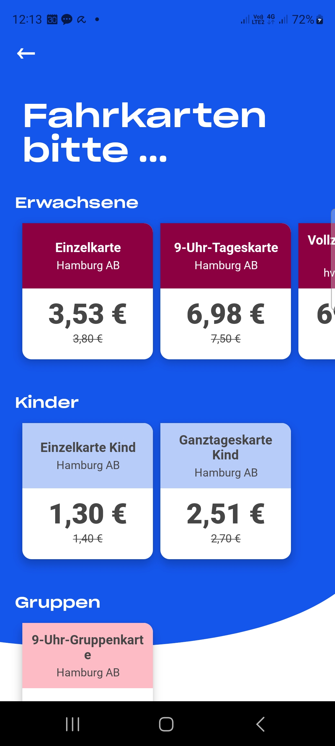 Eine häufige Wahl wird die 9-Uhr-Tages­karte im Bereich Hamburg AB sein. Dafür tippt man auf die entsprechende Zeile.